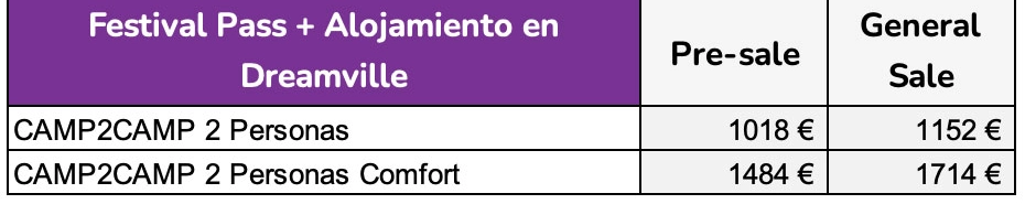 *Importante que sepas que se tendrá que hacer un depósito de 132 euros en el festival antes de poder entrar a tu zona Camp2Camp de 2 personas.
